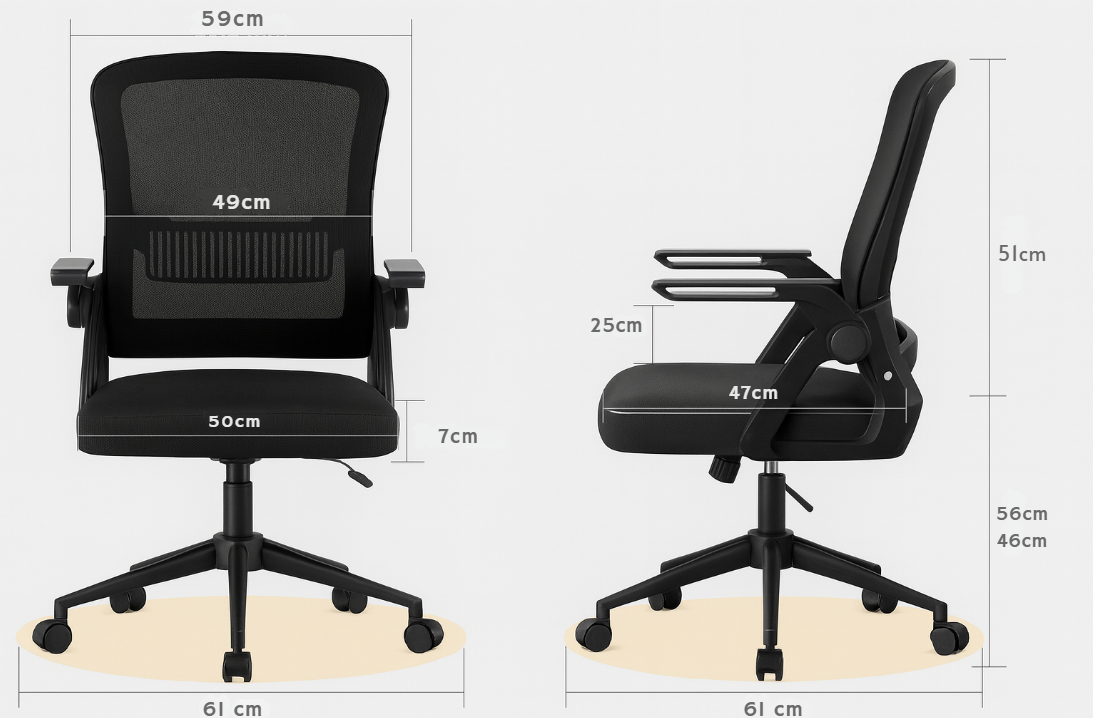- Accoudoirs relevables à 90° pour glisser la chaise sous le bureau