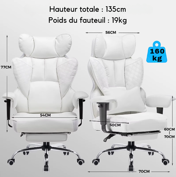 Offrez vous un confort haut de gamme au quotidien avec cette chaise de bureau design en cuir synthétique. Son dossier matelassé avec ailes latérales, son coussin lombaire intégré et son repose jambes escamotable assurent un maintien optimal pour travailler ou se détendre. Disponible en blanc ivoire, marron ou noir profond , elle s’intègre parfaitement dans tout intérieur moderne.