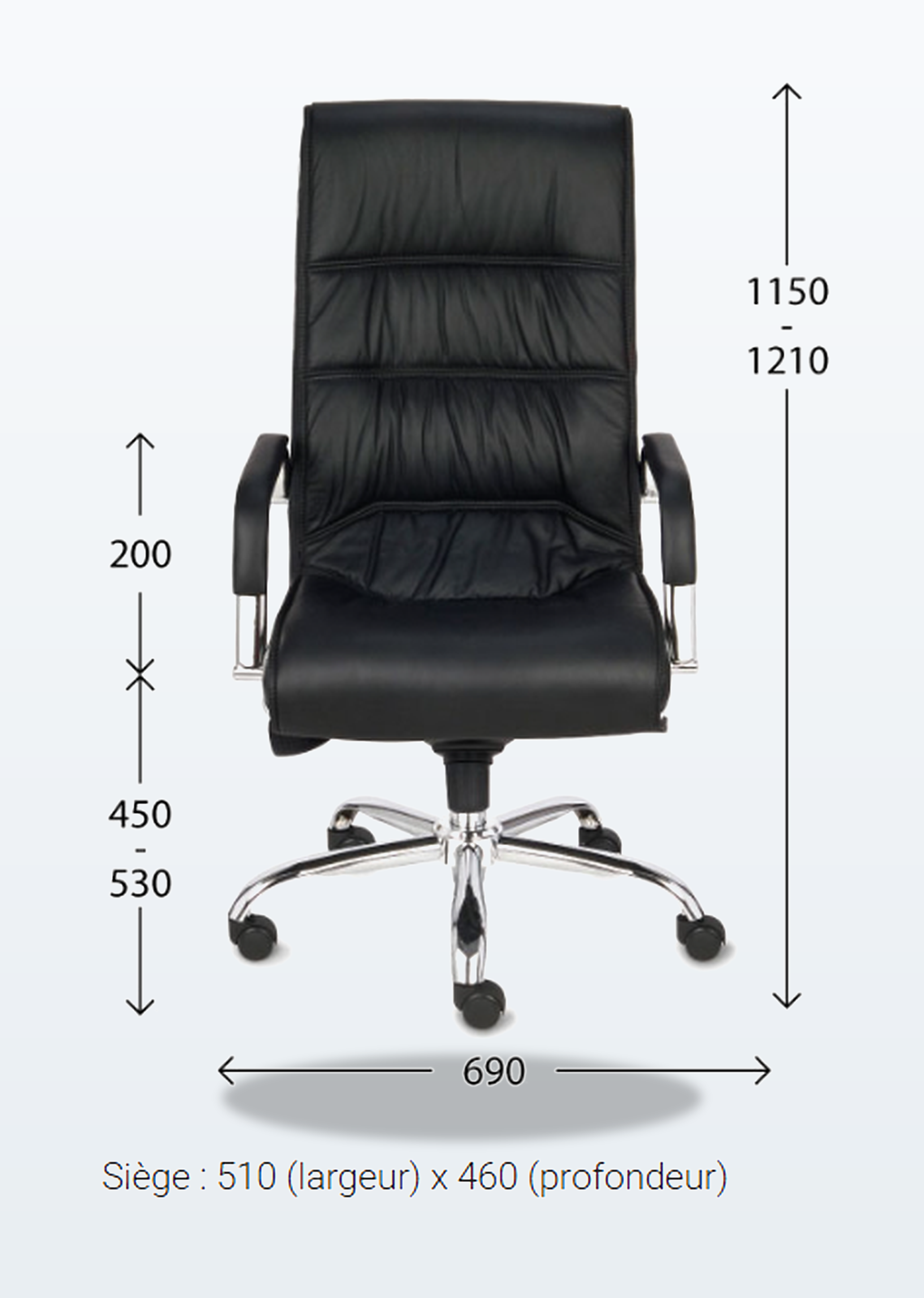 Hauteur réglable 1150–1210 mm, assise 510 x 460 mm, hauteur d’assise 450–530 mm. Alliant confort et élégance, ce fauteuil est idéal pour un usage quotidien.