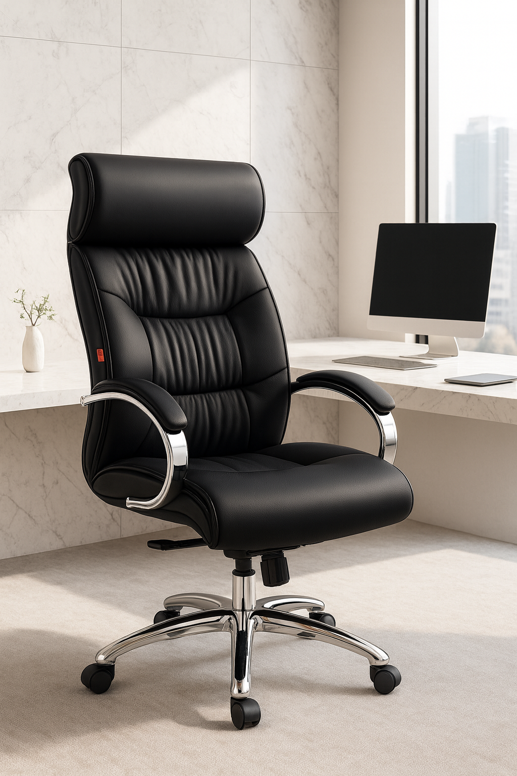 Son revêtement en cuir, son dossier ergonomique et son système d’inclinaison intelligent offre une assise enveloppante et un soutien parfait, même lors de longues journées. Élégant, solide, irrésistiblement confortable.
